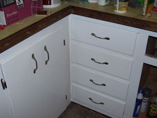 And my husband has done a wonderful job tiling the kitchen counters with .40 cent tiles from Lowes. Not bad for his first tiling job. All he has left is to put the wood trim around the back and them stain and poly.